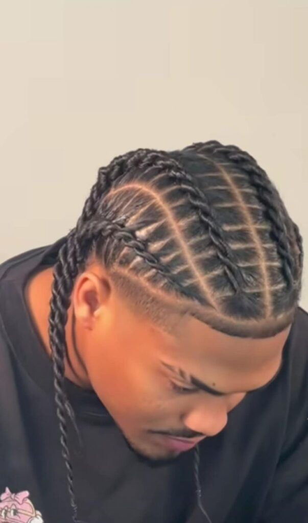Two-strand twists and cornrows provide layers of texture to the haircut. This technique involves braiding two pieces of hair, resulting in a rope-like twist that contrasts with the flat cornrows.