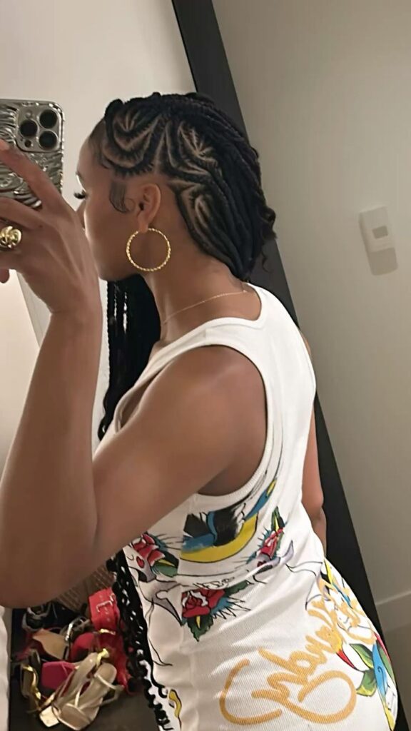 Instead of braiding straight back, the cornrows are braided to one side, creating an off-center parting that’s chic and modern.