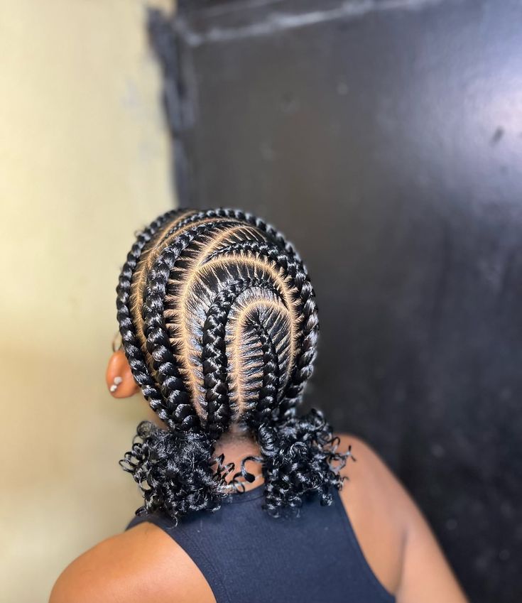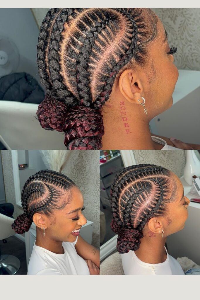 A fun and youthful style, this involves braiding the hair into cornrows that lead up to two buns on either side of the head. It’s playful yet protective, making it a popular choice for festivals or casual outings.