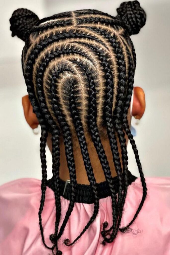 With medium-length hair, you’ve got the perfect amount of versatility. Double bun cornrows, braiding straight back and gathering each half into a bun, are playful yet practical, perfect for casual days or festival vibes. For a softer, more regal style, halo cornrows wrap around your head in a crown-like braid, keeping all your hair tucked away while still looking elegant.