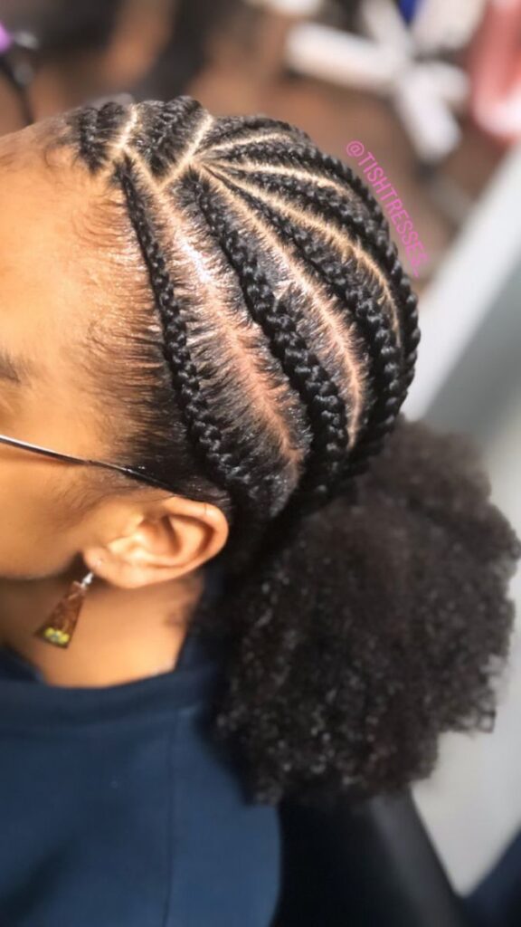 If you have long natural hair, you can take your cornrows to the next level with length-based styles. A braided ponytail is simple yet striking — cornrow your hair straight back or into creative patterns, then gather it high or low for a bold finish. For a formal or elevated look, cornrow your hair into an intricate updo, twisting and pinning the ends into shapes that work for special events.