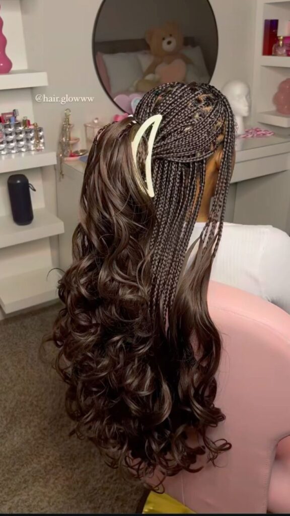Tie half your braids up and let the curls spill down your shoulders. It’s pretty, angelic, and perfect for photos, dates, or aesthetic days out.