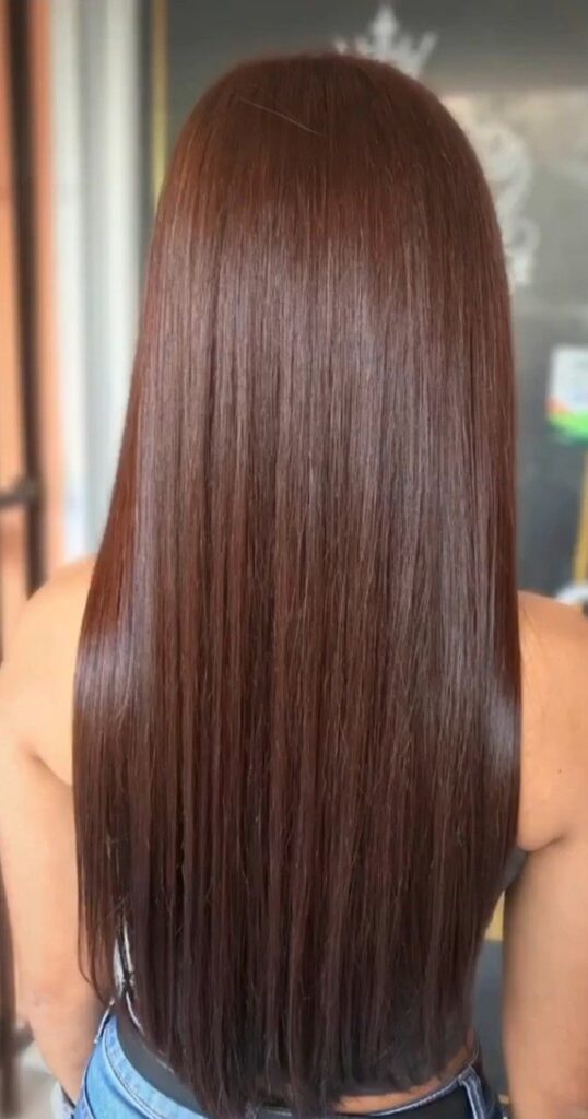Dark chocolate cherry is the perfect blend of deep brown richness with a slight cherry-red finish. It’s glossy, warm, and adds a juicy pop that doesn’t feel loud. Think “subtle red, but make it edible-looking.” It especially shines on silk presses and long layers because the cherry tone gives every strand a smooth, polished glow. This one makes your hair look healthy even when you did the bare minimum.