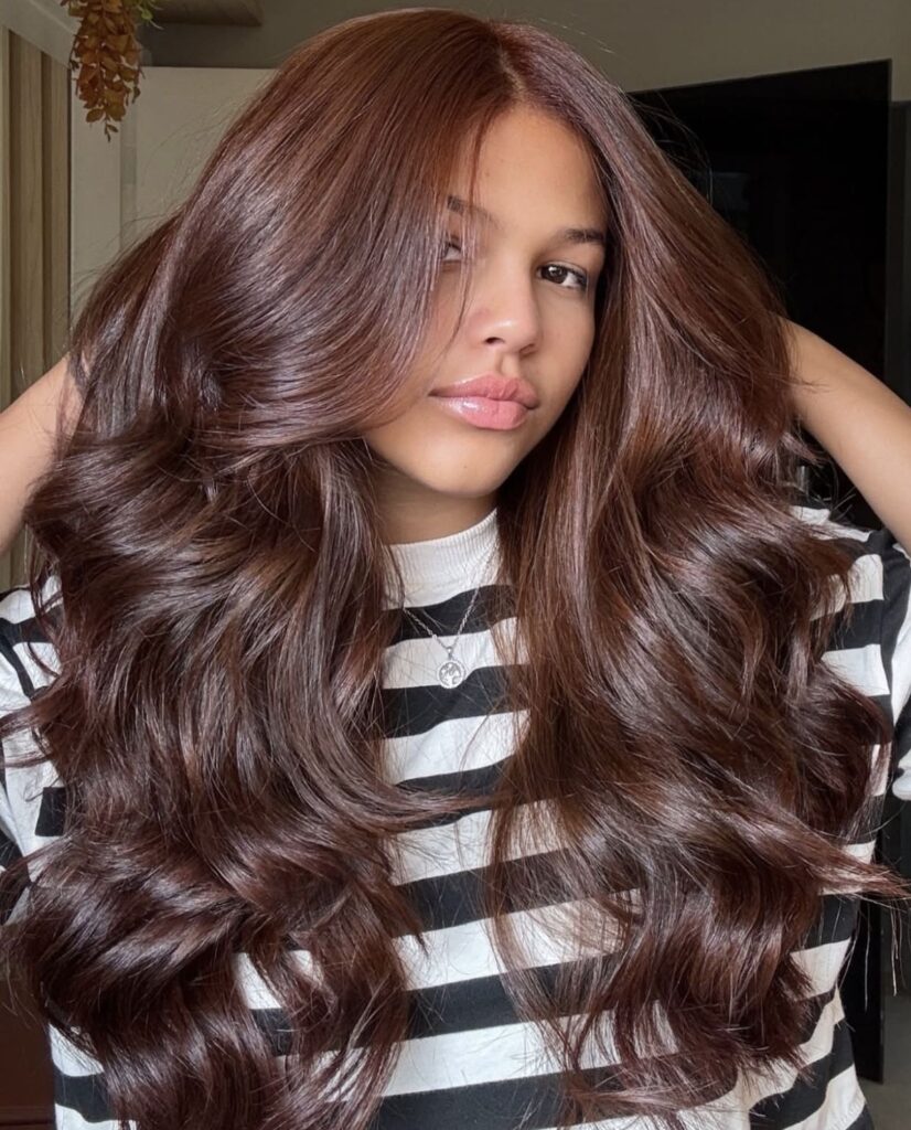 This is warm, sweet, and very feminine. Roseberry tones add softness and a rosy glow to the chocolate base, making this the perfect shade for anyone who loves warm shine. It brightens the face instantly and looks especially stunning in loose curls or a bouncy blowout. If you want a color that feels romantic and soft, this is the one.