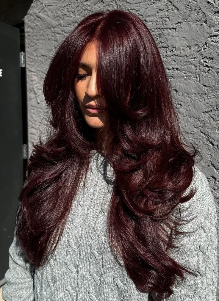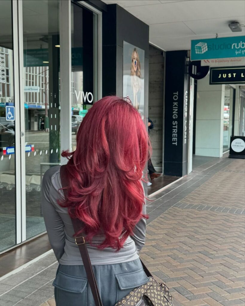 Layers bring out the natural depth of ruby red hair. When your hair moves, the color shifts subtly, giving a dynamic, expensive-looking finish. Long layers are perfect for softness; shag-inspired layers add boldness and edge.