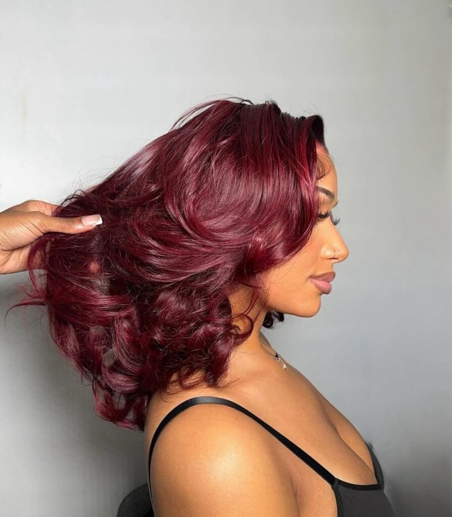 If your skin is deep or richly toned, you have the freedom to explore the most luxurious versions of ruby red. Deeper ruby shades, such as garnet ruby, velvet ruby, or plum-kissed ruby, create a striking contrast that enhances the natural glow of deeper skin. These shades add drama in the most elegant way, allowing the hair to look dimensional while making the complexion shine effortlessly.