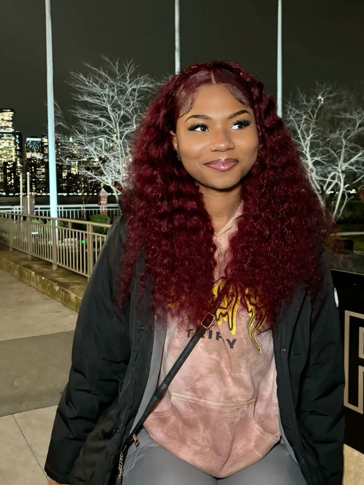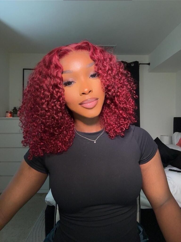 Curly ruby red hair is a showstopper. The curls create built-in dimension, making the shade look vibrant and full of life. Whether you’re rocking tight coils or loose spirals, defining creams and curl-enhancing gels help keep your texture juicy while enhancing color depth.