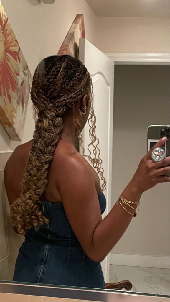 Want a pop of color without committing to a full dye job? Try adding colored extensions — honey blonde, burgundy, or even caramel — for a soft, sun-kissed look. The highlights give your braids depth and make them Instagram-ready from every angle.
