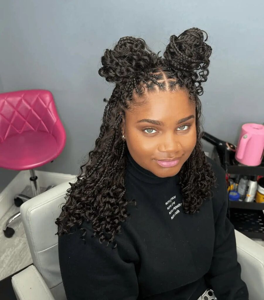 Double buns, double fun. This playful style is great for weekends or casual days. It gives a cute, youthful spin while showing off your braids’ length and color.