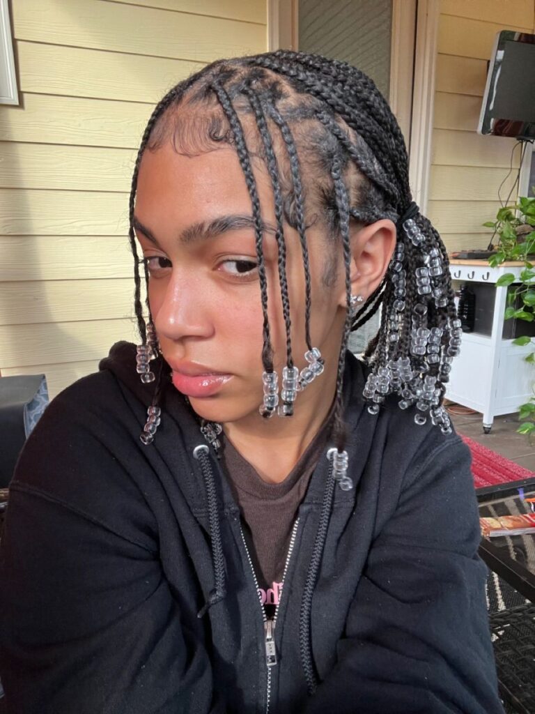 This classic combination is effortlessly chic. The braids sit right at the jawline while clear beads add a soft sparkle without overwhelming the look. It’s simple, elegant, and perfect for anyone who wants a clean, fresh vibe.
