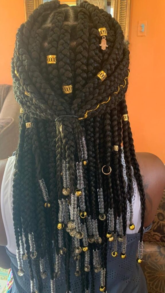 Add a touch of glam with gold cuffs near the roots and beads at the ends. The combination makes the braids feel rich, polished, and perfect for events, date nights, or vacations.