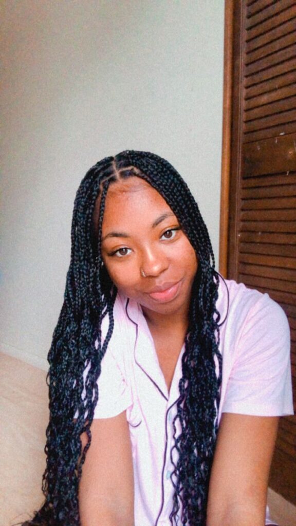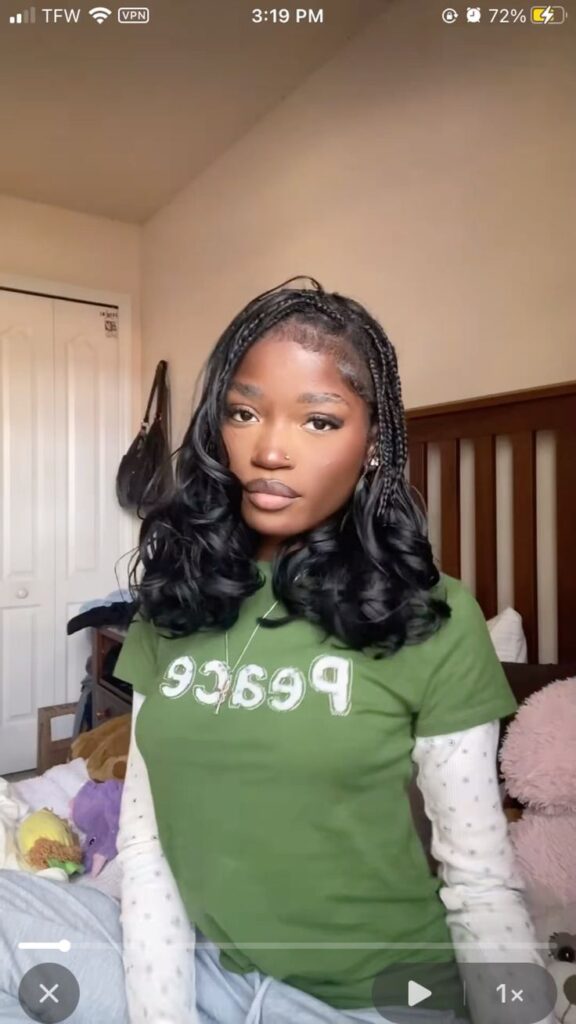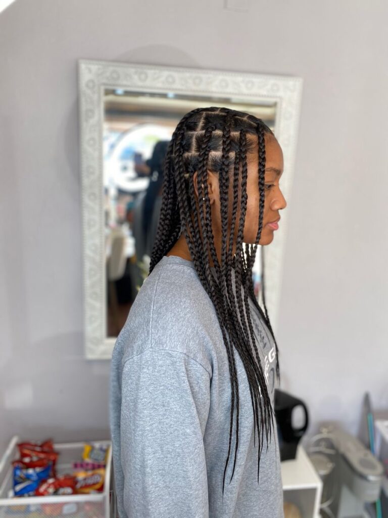 This timeless look is all about symmetry and simplicity. Parting your braids down the middle frames your face naturally and gives a clean, polished vibe. Perfect for workdays, casual outings, or running errands, it’s the kind of style that looks effortlessly put together without much effort. Add a touch of edge control to keep baby hairs sleek for an even more refined look.
