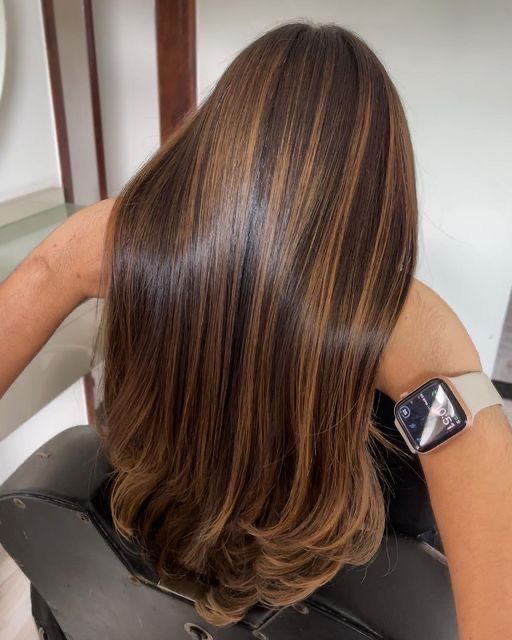 Highlights are the classic choice when you want brightness that pops without fully changing your base color. Satin caramel highlights add soft ribbons of light that frame the face, brighten your complexion, and make your hair look glossy under every angle. You get that polished, salon-fresh look — especially when paired with a silk press or big curls.