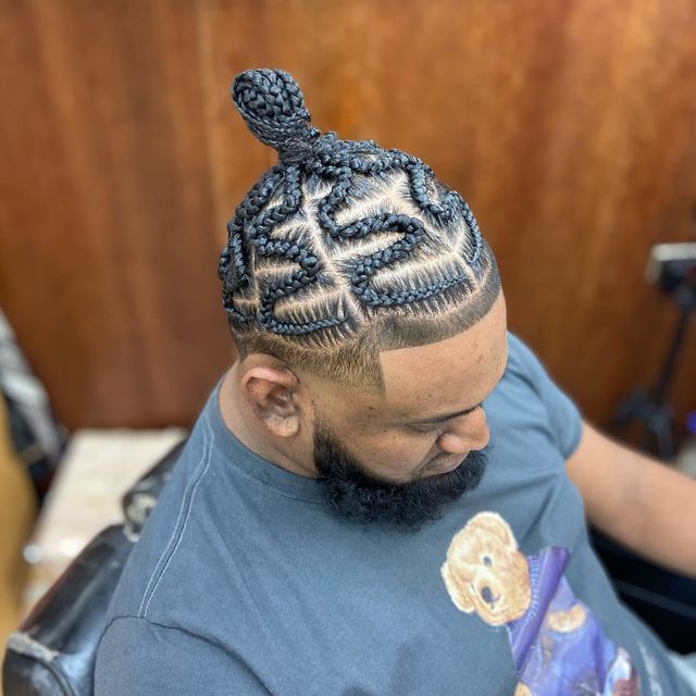 Combining functionality with style, this look involves braiding the hair into cornrows that culminate in a bun at the crown or back of the head.